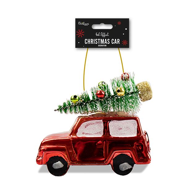 Bring festive cheer to your tree with this playful Christmas Car Decoration. Featuring a shiny metallic red car sporting frosted windows and a Christmas tree tied to its roof, it captures the joy of holiday traditions. Sized at 11cm x 11cm x 7cm, it’s just right for adding a charming touch to your festive décor.