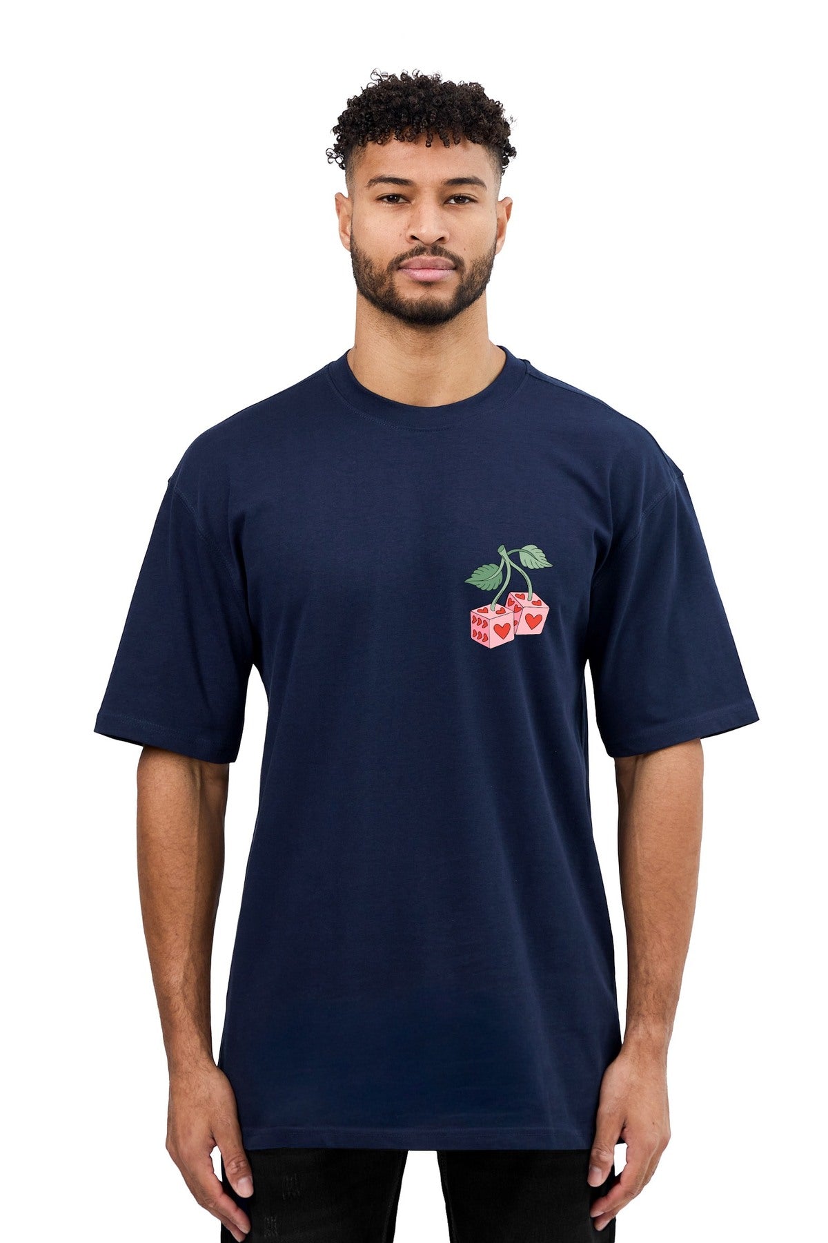 Black Industry navy crew neck short sleeve t-shirt with a relaxed fit that's perfect for everyday wear. The back features a striking cherry dice print that adds an edgy, contemporary touch to a classic silhouette. Ideal for those who appreciate bold graphic details and modern streetwear aesthetics. Comfortable and versatile, this tee pairs effortlessly with jeans, cargos, or shorts for a laid-back look with attitude.