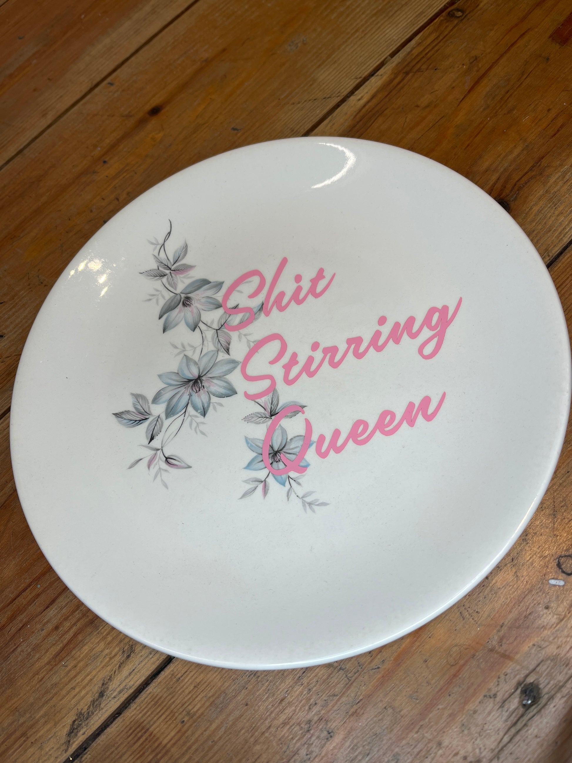 Spice up your dining experience with our "Shit Stirring" Vintage Plate. This handmade and unique piece features a grey and pink floral design, with the playful addition of the words "Shit Stirring Queen" in pink lettering. Perfect for those who love a little sass with their meal!
